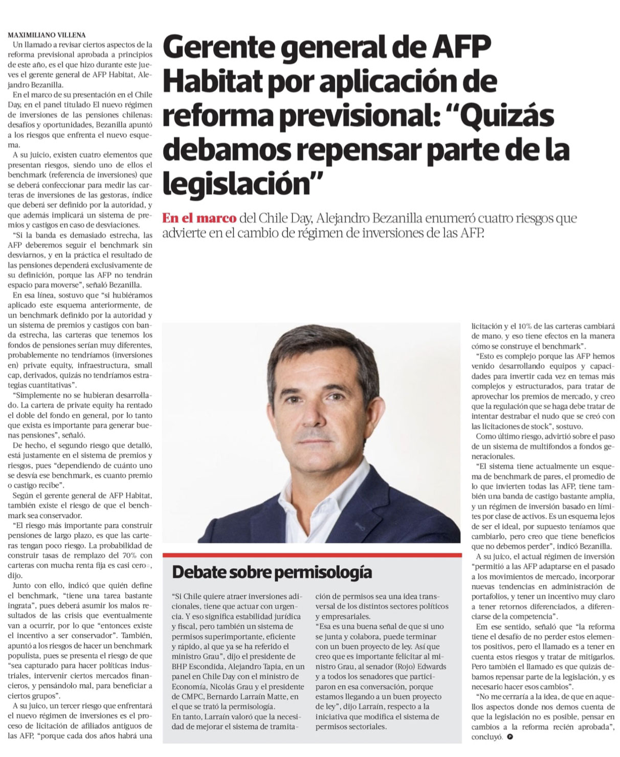 En el marco del ChileDay, Alejandro Bezanilla enumeró cuatro riesgos que advierte en el cambio de régimen de inversiones de las AFP advierte en el cambio de régimen de inversiones de las AFP Debate sobre permisología “Si Chile quiere atraer inversiones adicionales, tiene que actuar con urgencia.