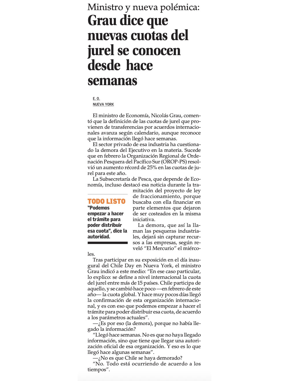 Tras participar en su exposición en el día inaugural del ChileDay en Nueva York, el ministro Grau indicó a este medio: “En ese caso particular, lo explico: se define a nivel internacional la cuota del jurel entre más de 15 países. Chile participa de aquello, y se cambió hace poco en febrero de este año la cuota global. Y hace muy pocos días llegó la confirmación de esta organización internacional, y es con eso que podemos empezar a hacer el trámite para poder distribuir esa cuota, de acuerdo a los parámetros actuales”.